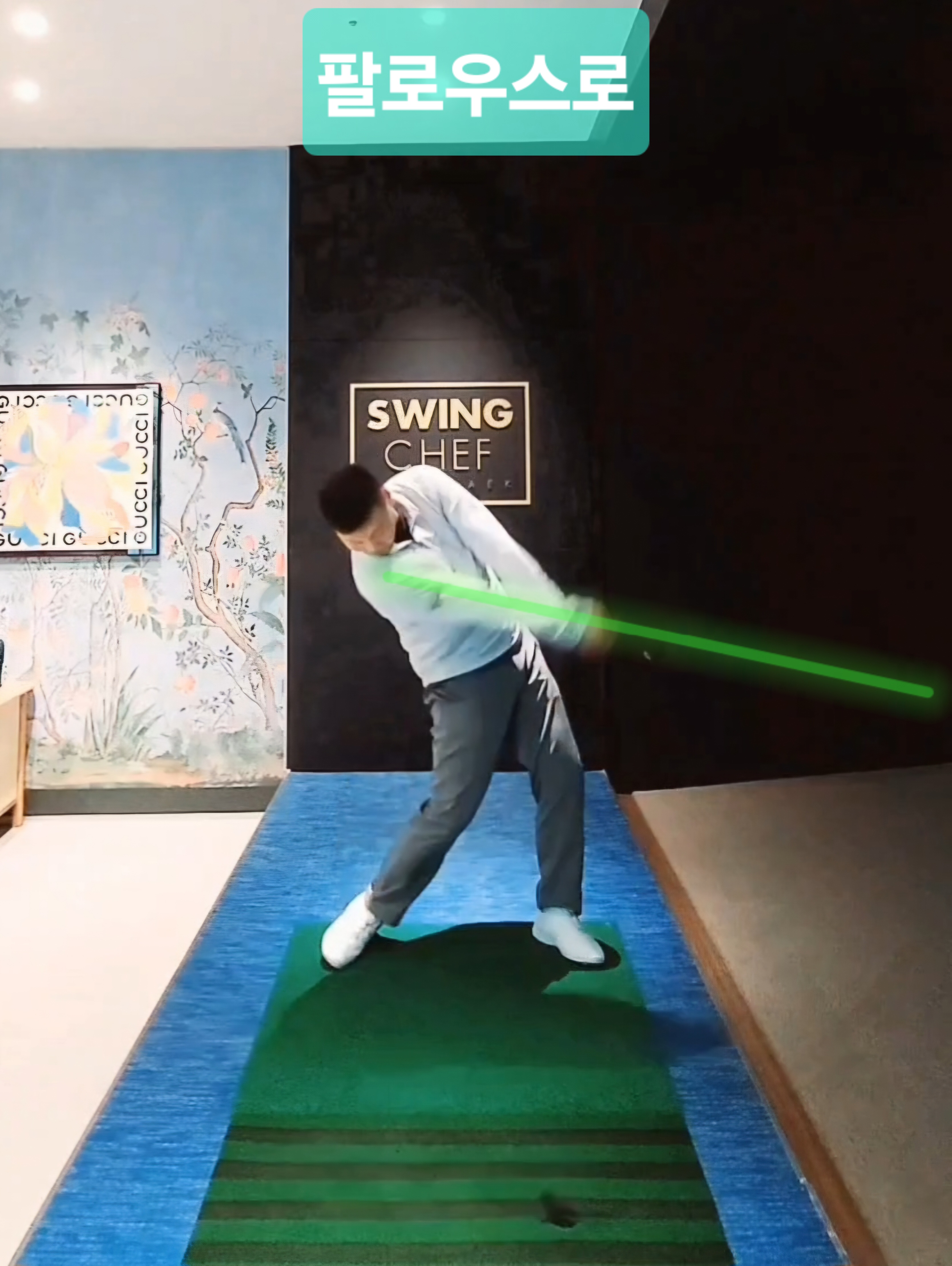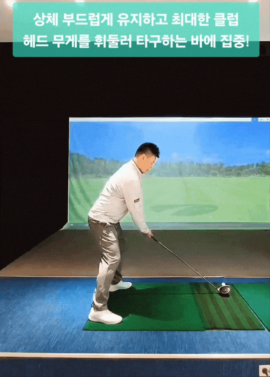 따라 돌며 상체는 조금 늦게 도는 느낌을 가집니다! 상체가 클럽보다 임팩트로