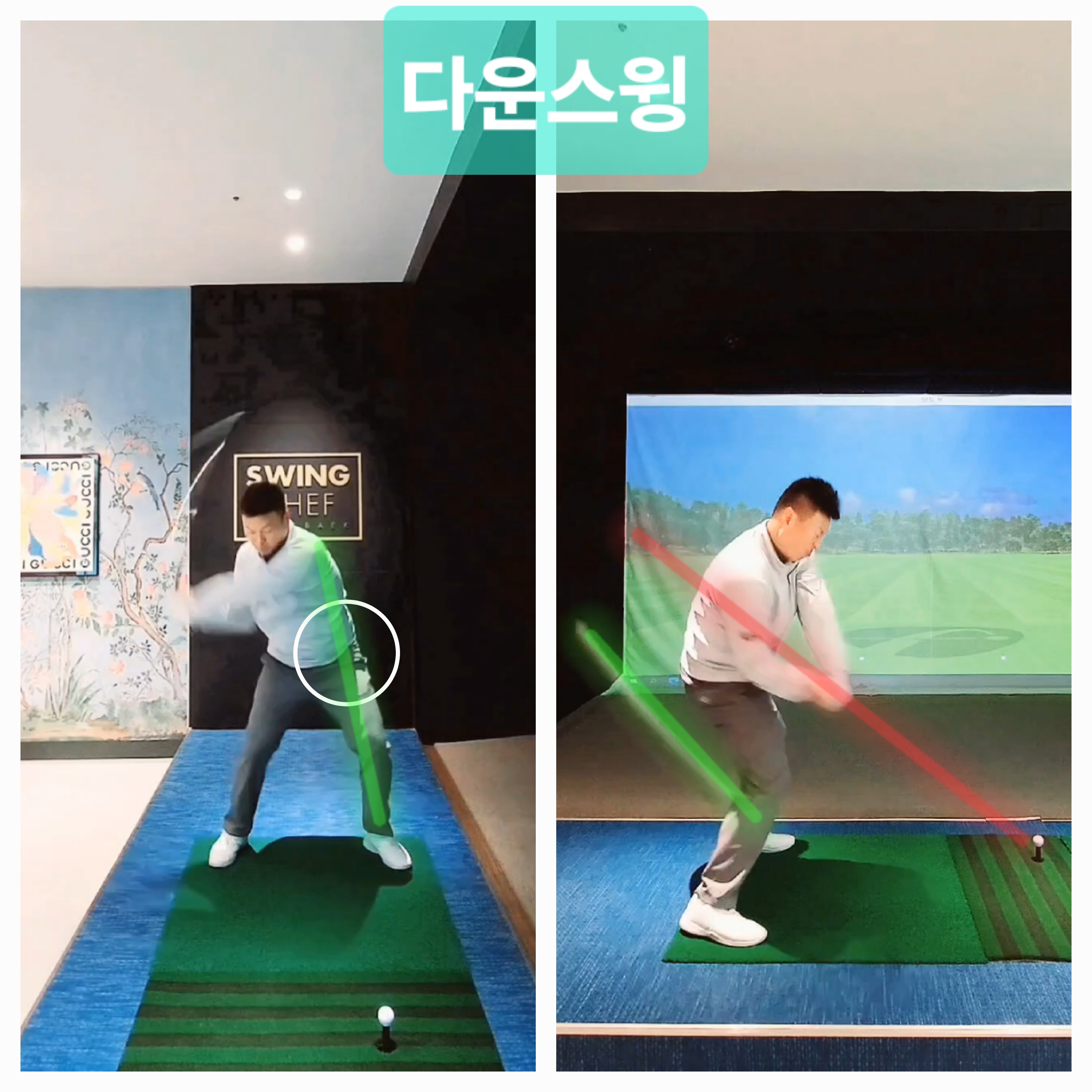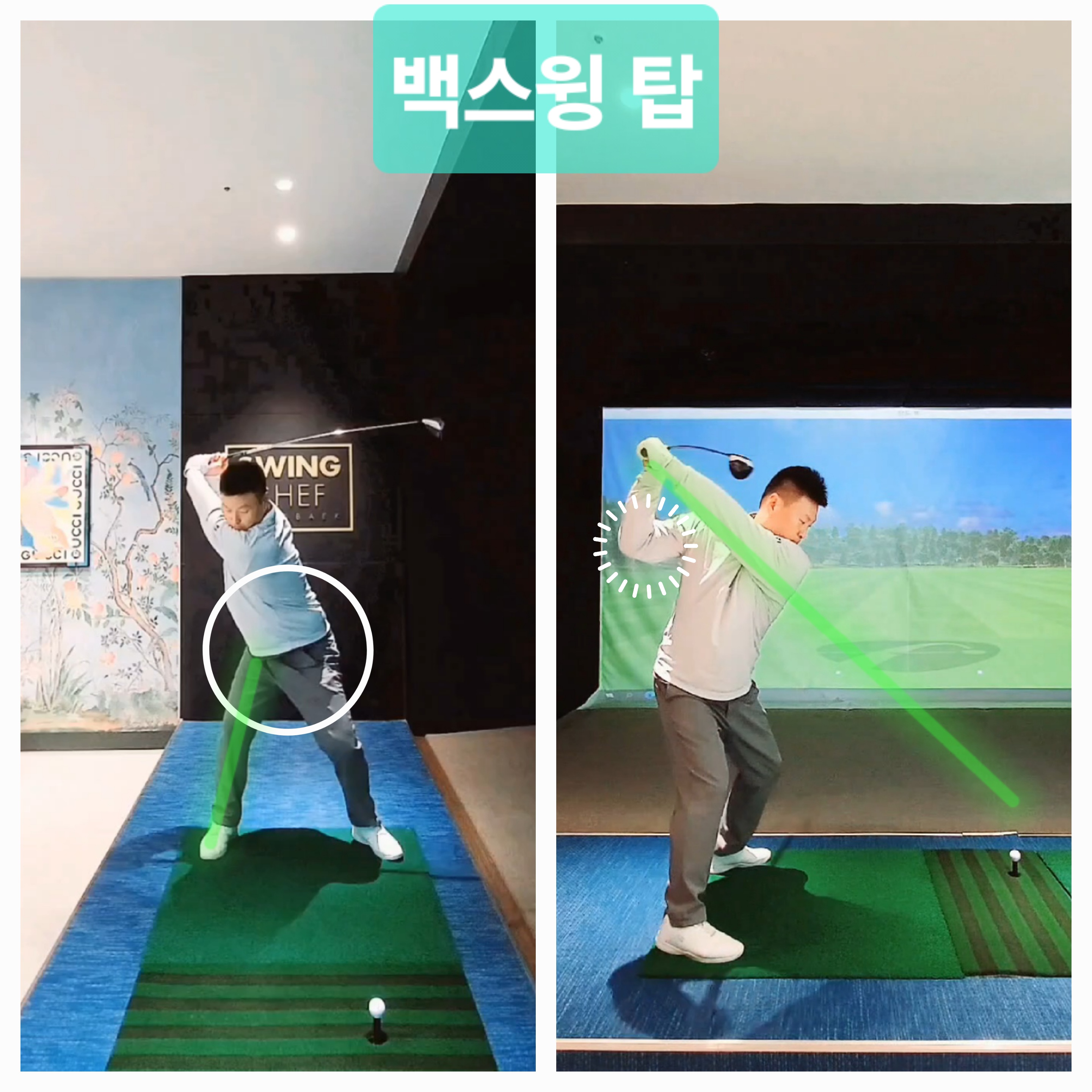 이후 백스윙 탑에서 셋업 때의 고관절과 오른 다리 위치를 최대한 유지 상태로