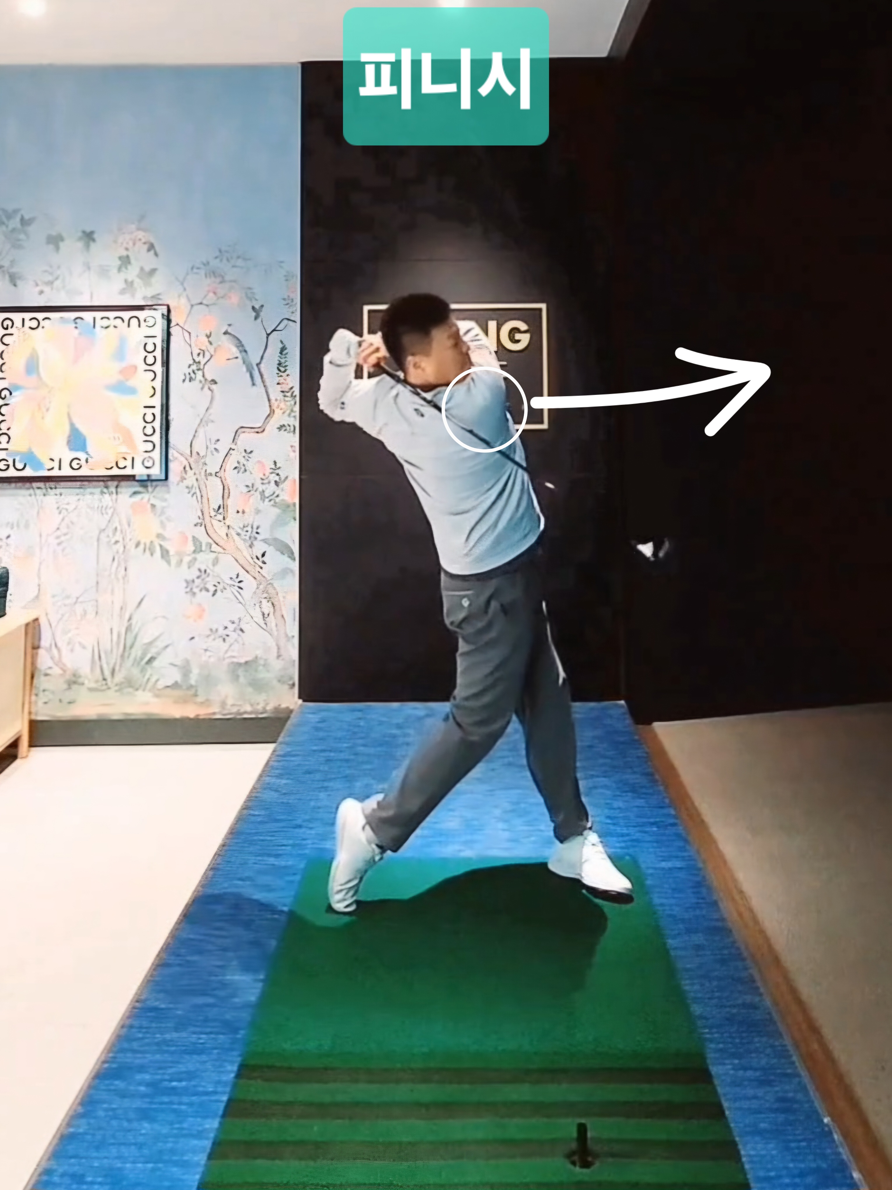 몸통이 회전하여 우측 어깨가 완전히 타깃을 향하도록 스윙을 마무리해 줍니다!