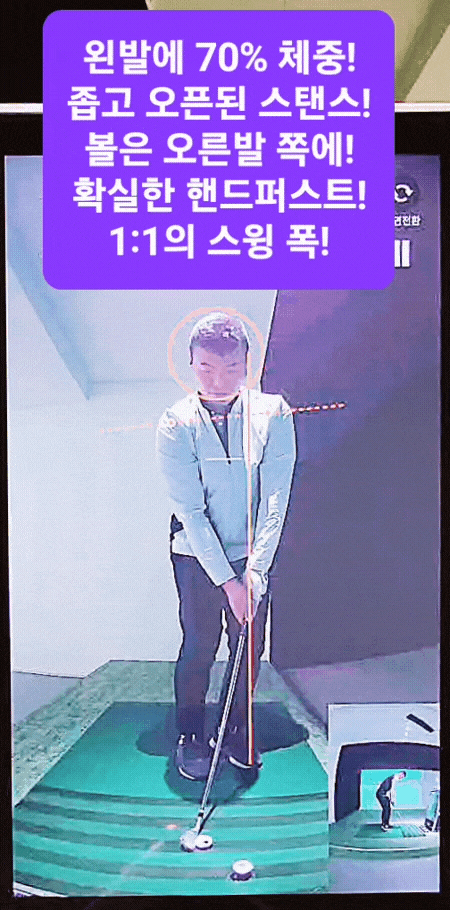 체중의 위치를 왼발에 최소 70% 실리게 하며 양손이 볼보다 타깃 방향 쪽으로 기운 핸드퍼스트를 확실하게 해 줍니다!
