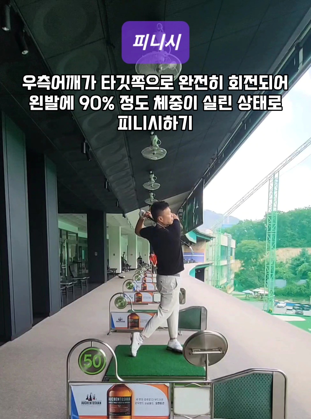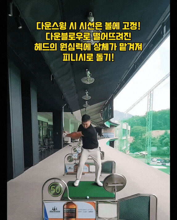 마지막 팁은 최소 임팩트 시점까지는 볼에 시선을 집중하고 다운블로우 임팩트 이후 떨어뜨려진 클럽헤드의 원심력에 상체가 맡겨져 피니시로 돌아주는 겁니다! 볼에 집중된 시선으로 떨어뜨리는 타격에 대해 좀 더 느끼게 되고 볼에 떨어뜨려 던져진 헤드에 몸통 회전을 맡김에 팔로우스로 시 양팔도 자연적 펴지며 피니시로의 체중이동이 원활히 이뤄질 겁니다!