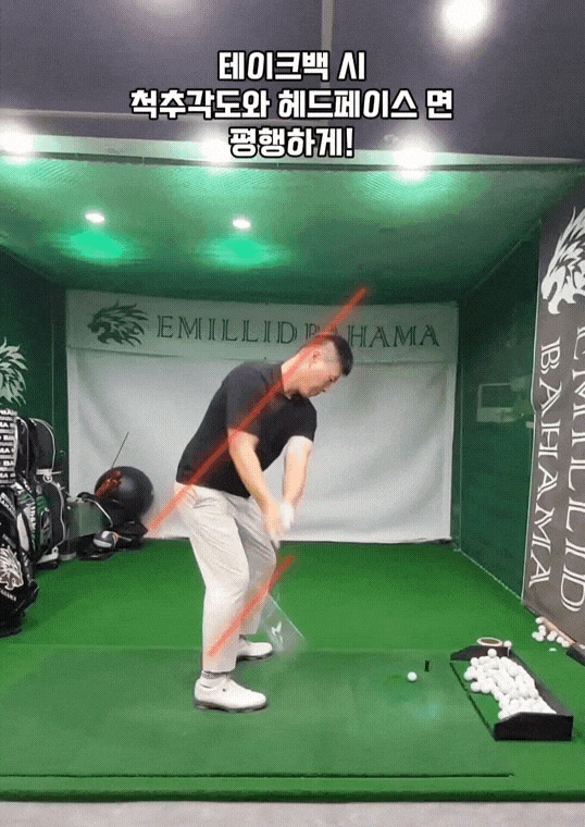 첫 번째는 어드레스 시의 척추각도 기울기를 백스윙에서 임팩트까지 최대한 균일하게 유지하면서 테이크백과 다운스윙 시에 헤드 페이스 면의 각도가 척추각도와 평행하게 해주는 겁니다! 이 두 가지 각도가 볼을 정확히 눌러치는 다운블로우 샷에 긍정적 영향을 줍니다.