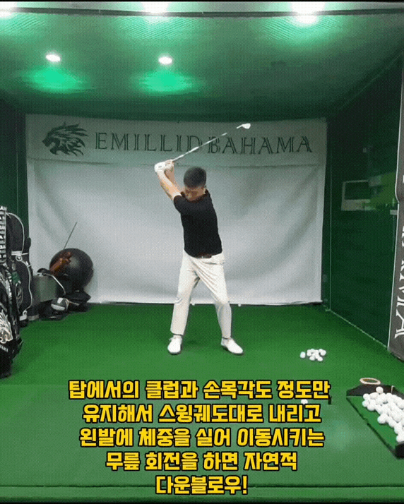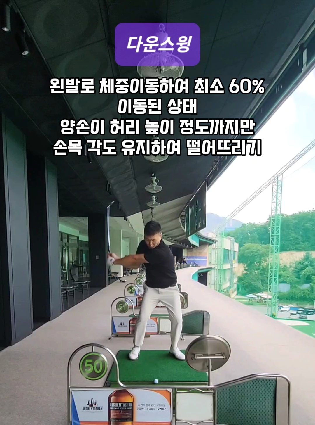 이때 왼발로 체중이 약 60% 정도 이동하여 골반 회전이 서서히 이뤄집니다. 탑에서의 손목각도를 양손이 허리 높이 정도 위치까지만 유지한다는 느낌으로 클럽을 떨어트려줍니다.