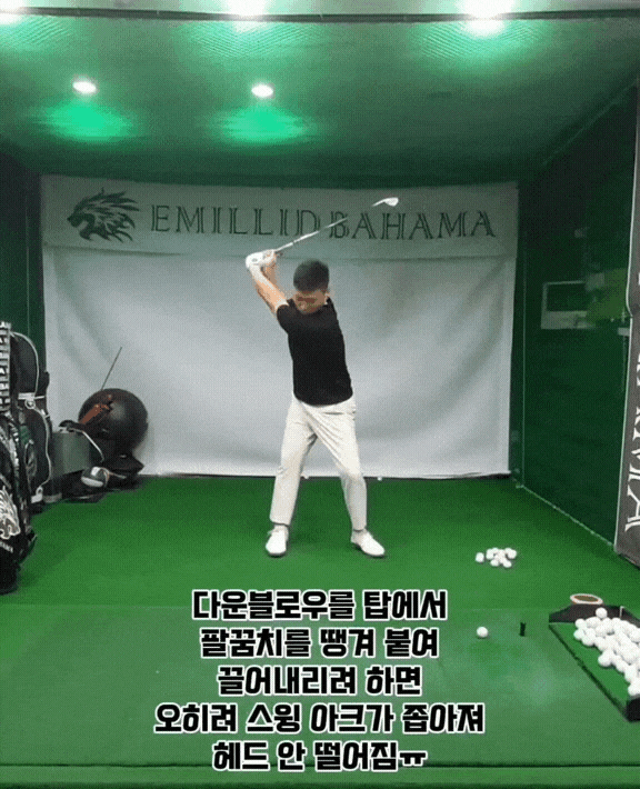 이 과정에서 많이들 오류를 범하는 것이 볼을 눌러 찍어치려고 탑에서 오른 팔꿈치를 과도히 몸 쪽으로 당겨 붙여 의도적으로 끌어내리려 하시는데 이는 다운스윙 아크가 좁아져 임팩트에 헤드가 적절히 안 떨어지고 떨어지더라도 너무 좁은 접근각과 충분치 못한 체중이동으로 강한 임팩트는 물론 방향성에도 악영향을 미치기에 유의해야 합니다!