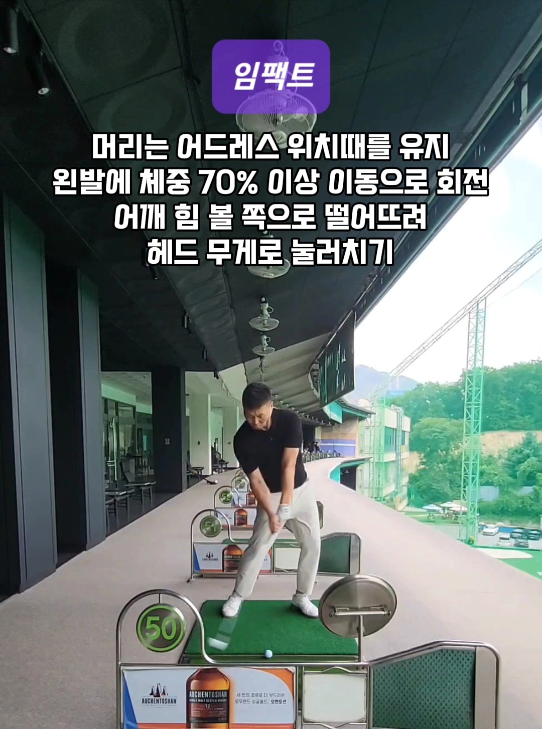 머리 위치는 최대한 자신의 중심에 위치하고 볼을 잘 주시하면서 왼발에 70% 이상 체중이동되어 타깃으로의 왼 골반 회전이 연결되어 이뤄지며 어드레스 시 발가락 쪽에 두었던 무게중심 위치를 잘 유지해 줍니다. 그에 어깨 힘이 빠지면서 양손은 포워드프레스된 형태로 클럽헤드 무게를 볼에 떨어뜨리면 눌러치는 다운블로우 샷이 발생됩니다!