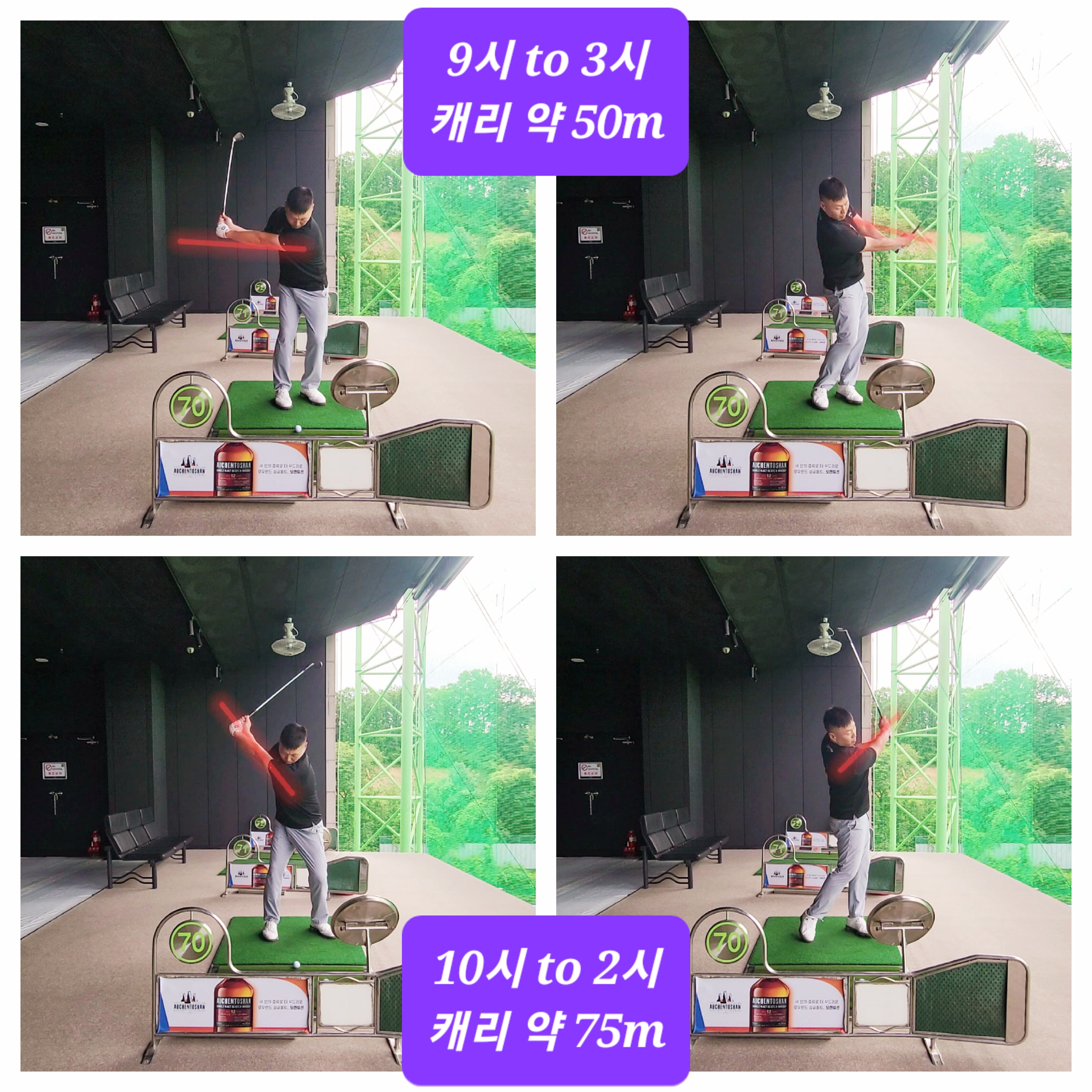한데 이를 어떤 분들은 단순히 풀스윙 자세를 기준으로 스윙 크기만 조절하여 샷을 구사하시는데 이때 생각보다 탑핑, 뒤땅 등의 미스샷도 많이 발생하고 거리감도 적절히 맞추기가 어려워서 되려 풀스윙이 차라리 쉽다고도 하십니다.
