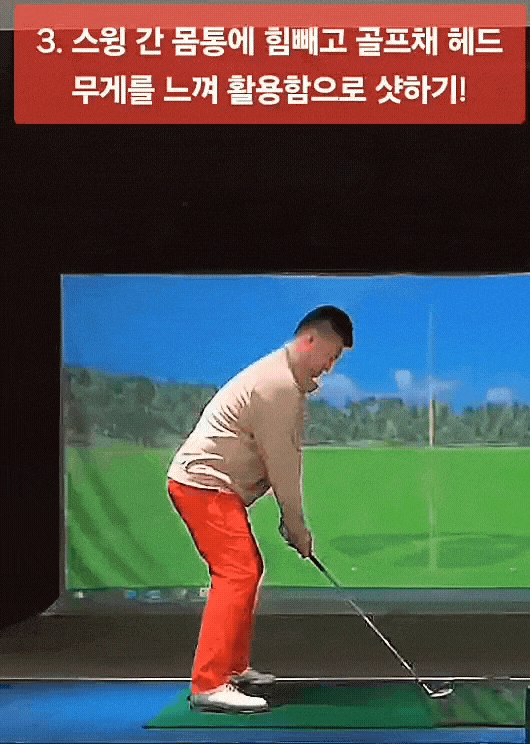 스윙이 이뤄지는 동안 몸통 쪽에 힘을 부드럽게 빼고서 골프채의 헤드 무게를